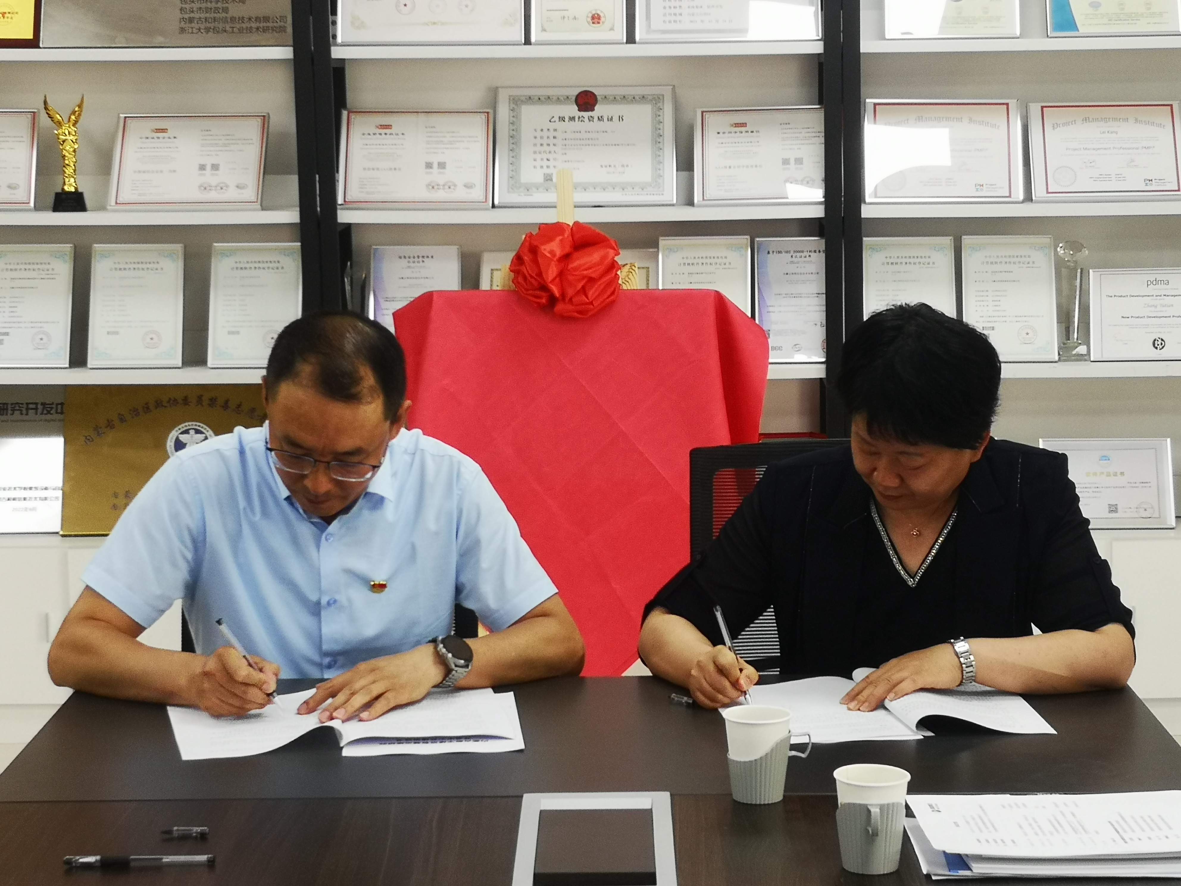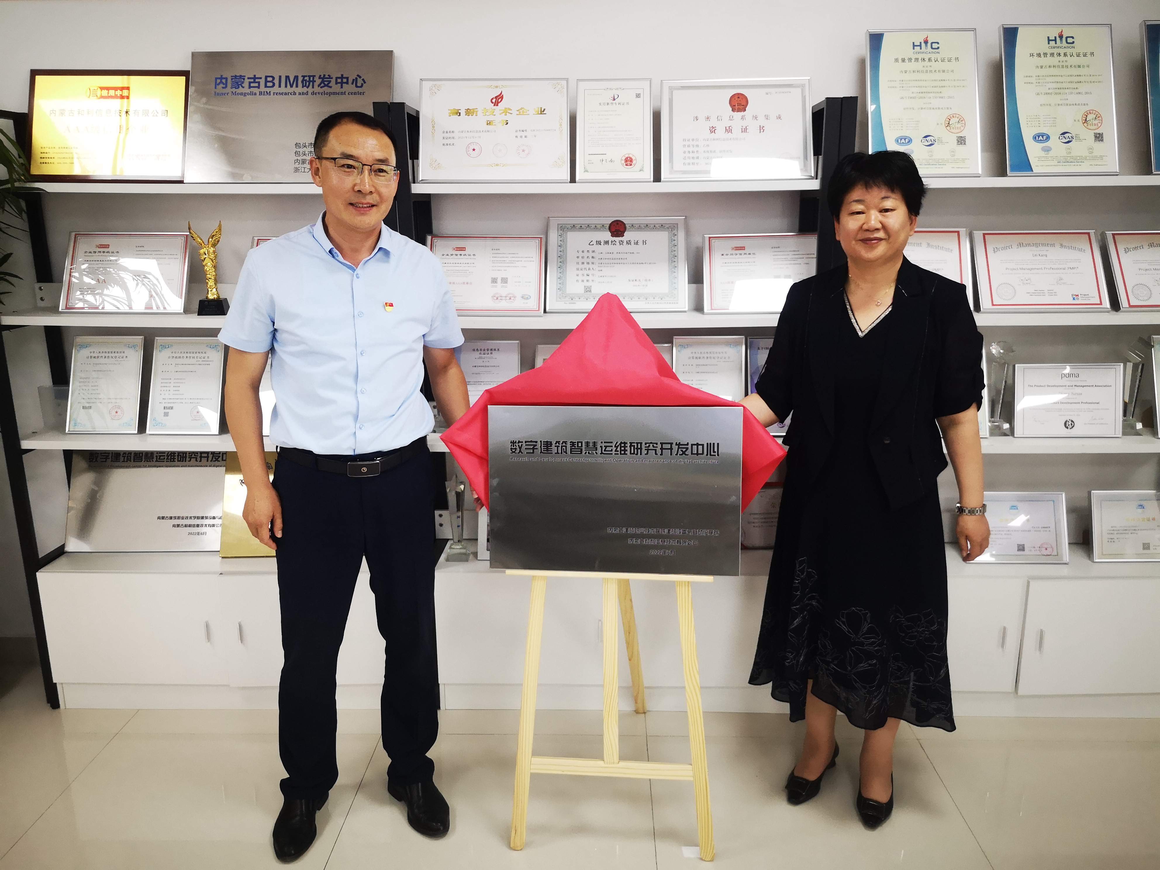 會(huì)議中,院長王文琪與集團(tuán)黨支部書記、副總經(jīng)理、和利信息總經(jīng)理張偉進(jìn)行“數(shù)字建筑智慧運(yùn)維研究開發(fā)中心”簽約授牌儀式。