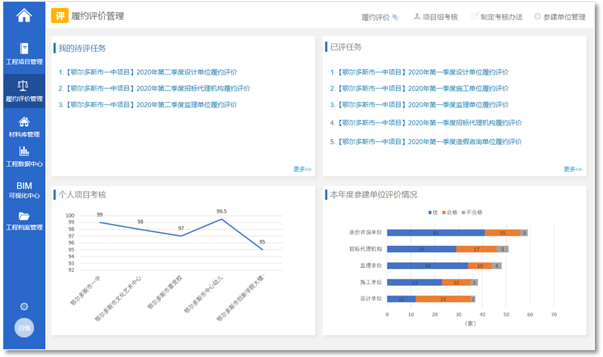 系統(tǒng)支持制定評(píng)價(jià)辦法,發(fā)起評(píng)價(jià)任務(wù),對(duì)參建單位進(jìn)行履約評(píng)價(jià)。通過評(píng)價(jià)結(jié)果,對(duì)參建單位進(jìn)行管理并設(shè)置參建單位黑名單,并根據(jù)履約評(píng)價(jià)結(jié)果進(jìn)行綜合排名。