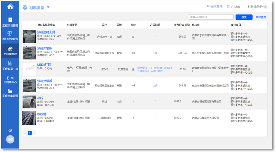 材料庫主要對(duì)項(xiàng)目過程中已使用材料的類型、名稱、參數(shù)、價(jià)格、型號(hào)以及所用項(xiàng)目進(jìn)行管理,方便在新建項(xiàng)目時(shí)快速定位同類型、高品質(zhì)、價(jià)格合理的材料。