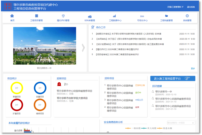 該平臺(tái)由工程項(xiàng)目管理、履約評(píng)價(jià)管理、材料庫管理、工程數(shù)據(jù)中心、BIM可視化中心、工程檔案管理六個(gè)子系統(tǒng)組成。主要包含了立項(xiàng)管理、前期手續(xù)管理、招投標(biāo)管理、合同管理、設(shè)計(jì)管理、施工現(xiàn)場管理、投資控制、工程驗(yàn)收、質(zhì)保期管理、項(xiàng)目后評(píng)價(jià)、參建單位履約評(píng)價(jià)、工程檔案管理、工程數(shù)據(jù)中心、BIM可視化中心、等功能,對(duì)近40個(gè)業(yè)務(wù)單位進(jìn)行精細(xì)化管理。