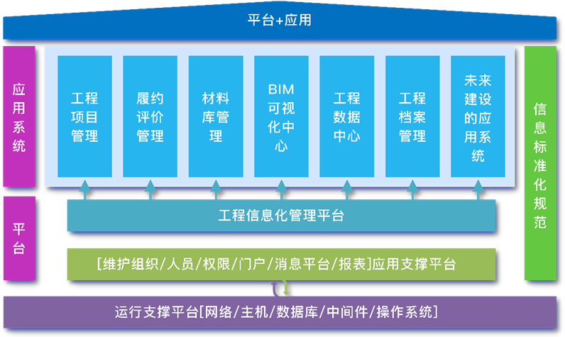 該平臺(tái)由工程項(xiàng)目管理、履約評(píng)價(jià)管理、材料庫管理、工程數(shù)據(jù)中心、BIM可視化中心、工程檔案管理六個(gè)子系統(tǒng)組成。主要包含了立項(xiàng)管理、前期手續(xù)管理、招投標(biāo)管理、合同管理、設(shè)計(jì)管理、施工現(xiàn)場管理、投資控制、工程驗(yàn)收、質(zhì)保期管理、項(xiàng)目后評(píng)價(jià)、參建單位履約評(píng)價(jià)、工程檔案管理、工程數(shù)據(jù)中心、BIM可視化中心、等功能,對(duì)近40個(gè)業(yè)務(wù)單位進(jìn)行精細(xì)化管理。